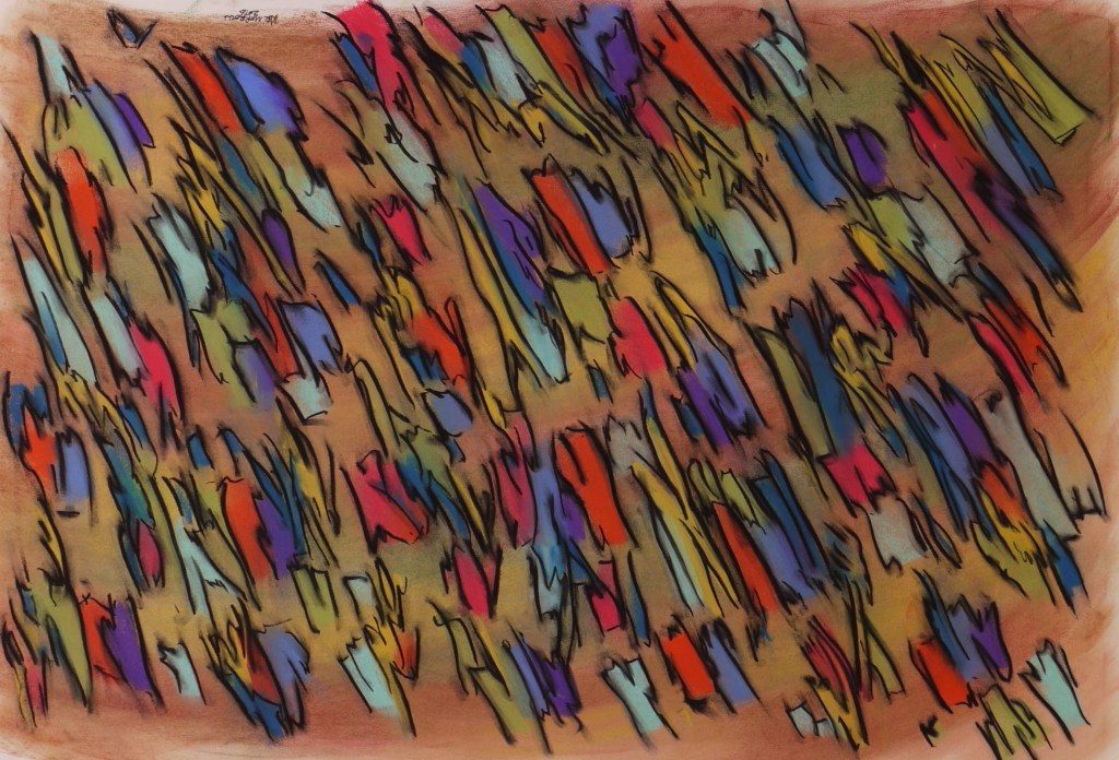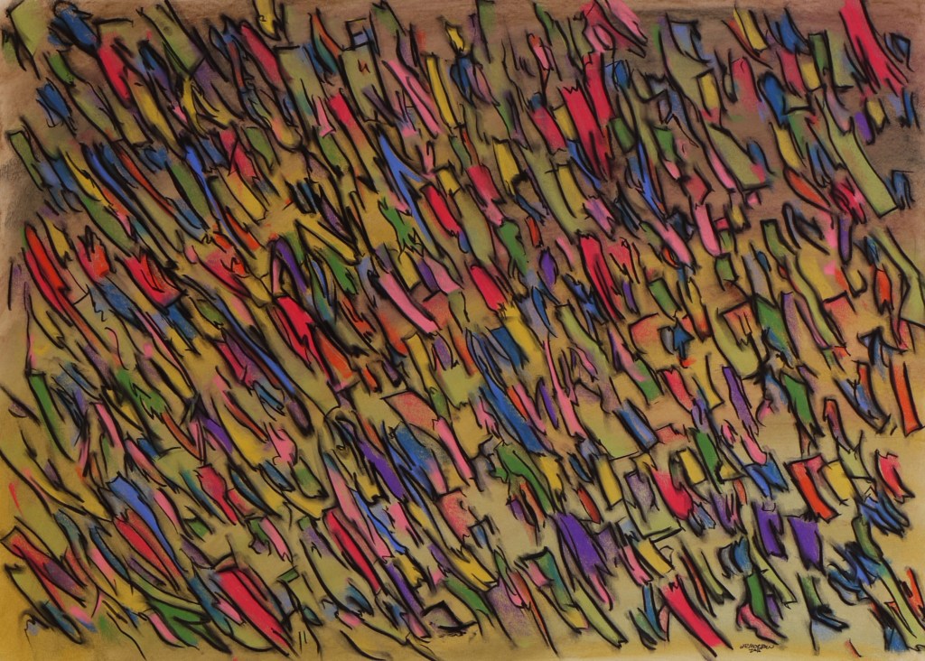 I’ve made quite a few abstractions of this character, starting with a graded background in one color, marked over by random strokes in other colors, with the randomness of the strokes later reified by strict black outlines of the shapes that emerge. See other examples in the gallery below.