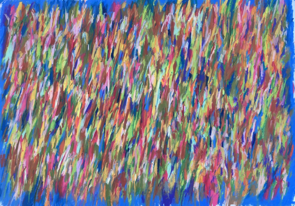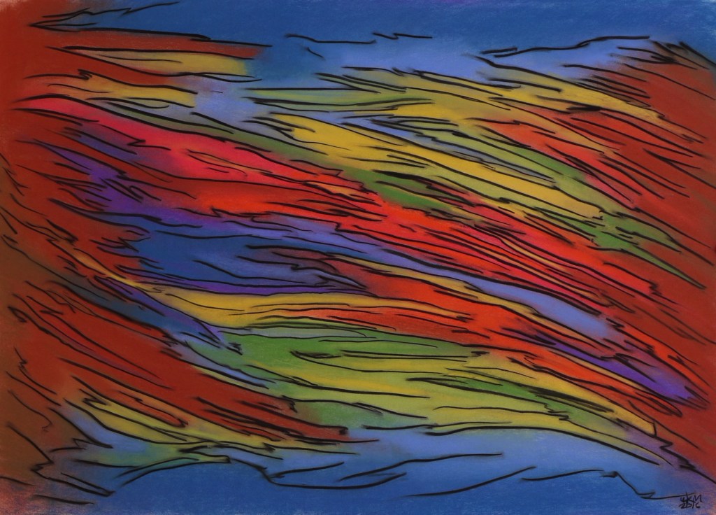 This is another type of abstraction I have enjoyed doing. The process — filling space with short, random strokes of color until satisfied — strikes me as somewhat similar to rain and thus the name. Like other works, most of these I also emphasize and add structure to the randomness of the strokes with solid black outlines. See other examples in the gallery below.