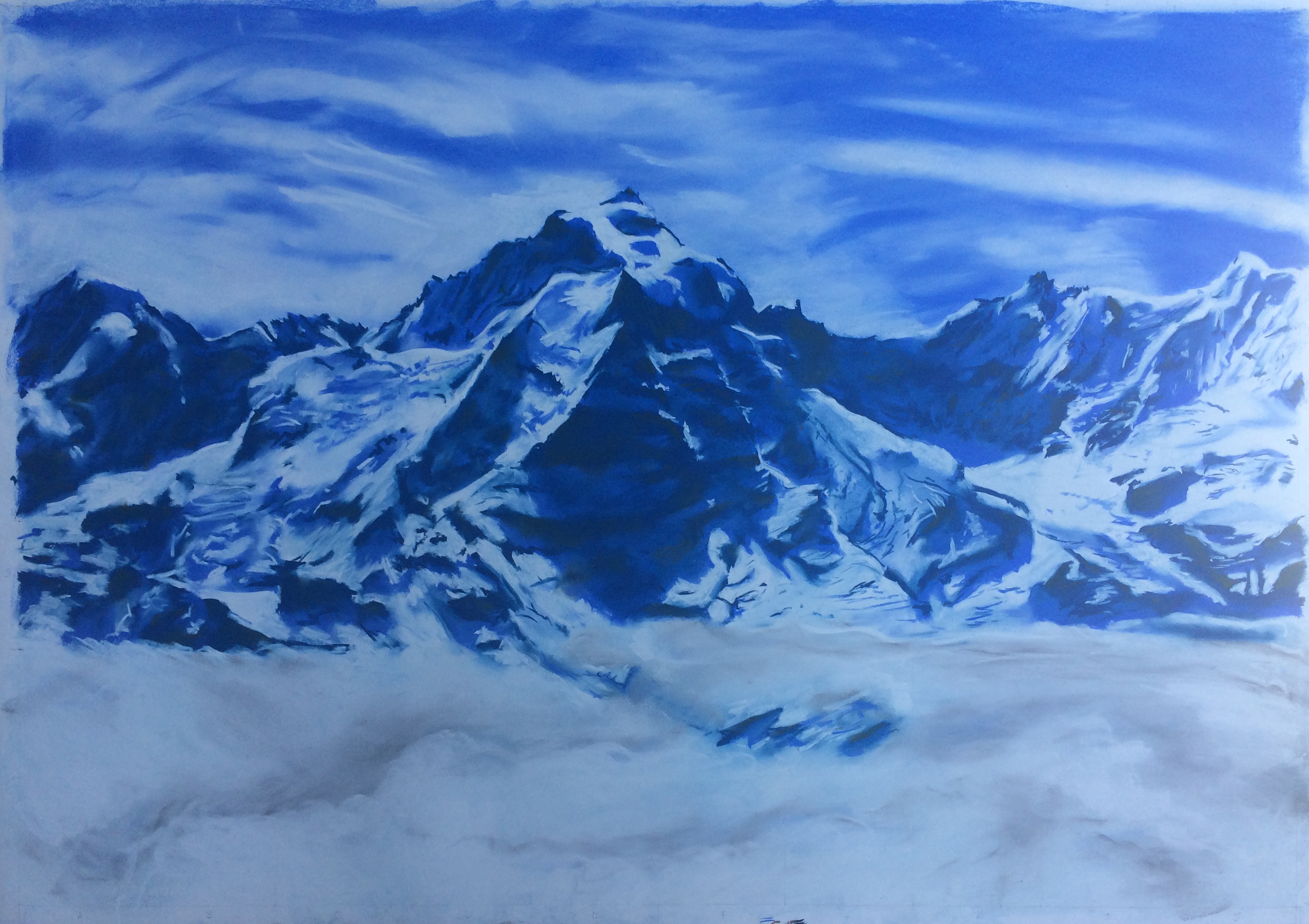 I do do some realistic work, such as this reproduction of a photo I took at Schilthorn in Switzerland. My technique here is just to reproduce parts of the target image in stages, using a rectangular grid of cells defined over the image used. See other examples in the gallery below.