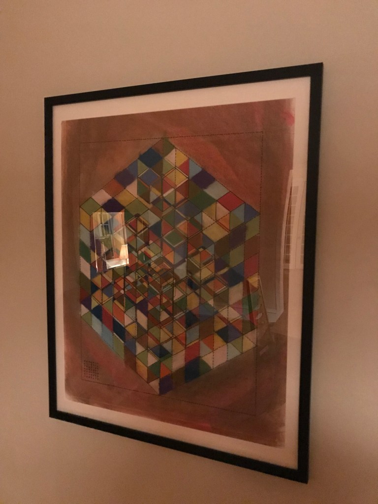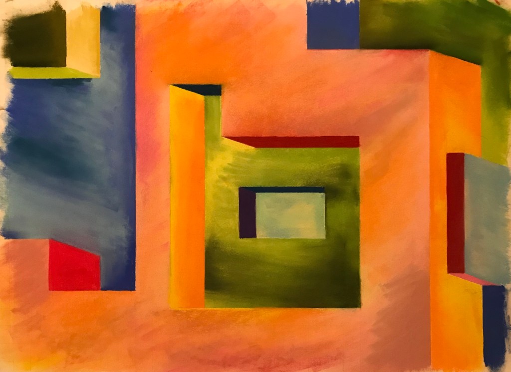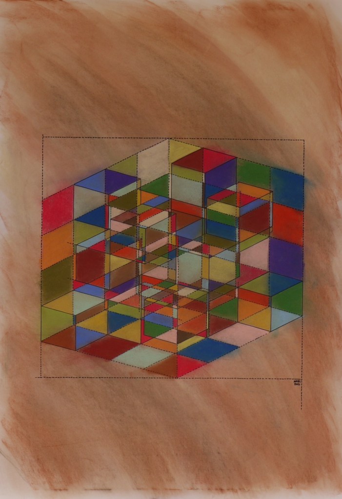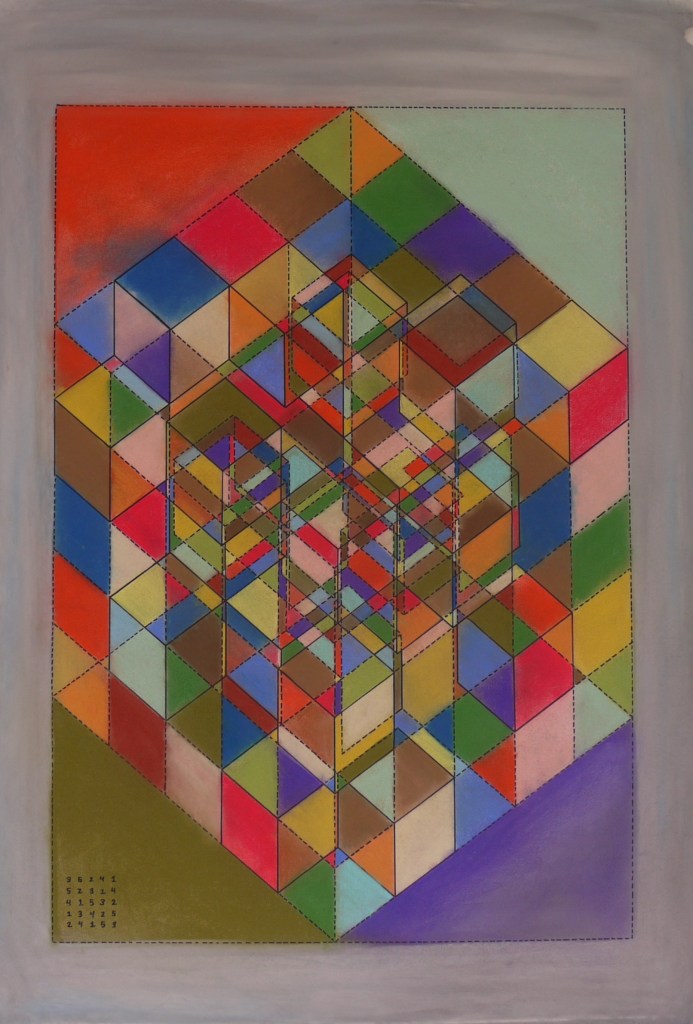 I have done a number of “soduko” like pieces that combine structure and randomness. I choose a “sudoko” layout defining the depth of a “hypercube” like structure, sketch it correctly on paper, outline all of the lines used to sketch (including “ancillary” lines used only for sketching accuracy), and then randomly color in all the associated polygons. This gives a sense of depth and shape but confused by the flatness of the color scheme. I’ve done some number of these, and am working on more. See other examples in the gallery below.
