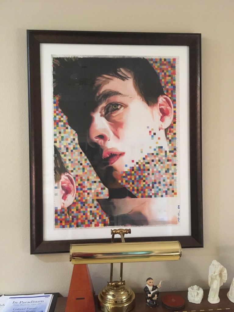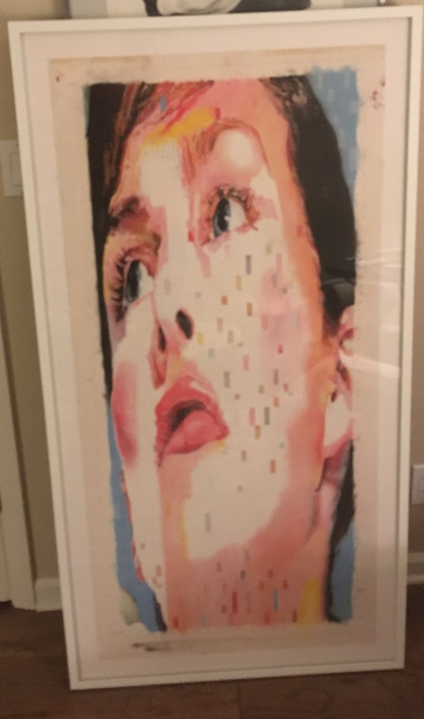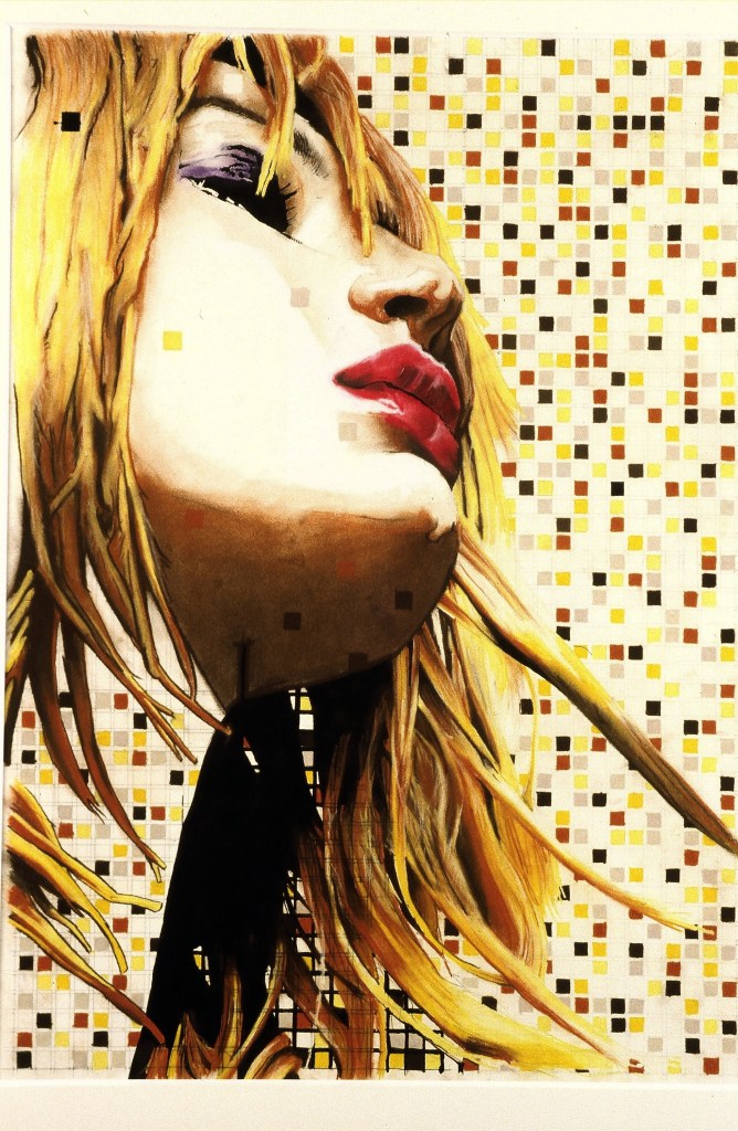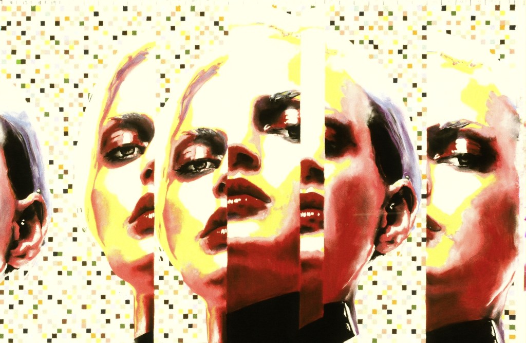This is a self portrait I made many years ago. I was interested in combining a realistic portrait with “mobius-like” repetition, in different styles, blending in and out of a flat pixelated ground. I made a number of such portraits (this being the only self portrait) exploring repetition, transformation, and depth in a flat ground. See other examples in the gallery below.