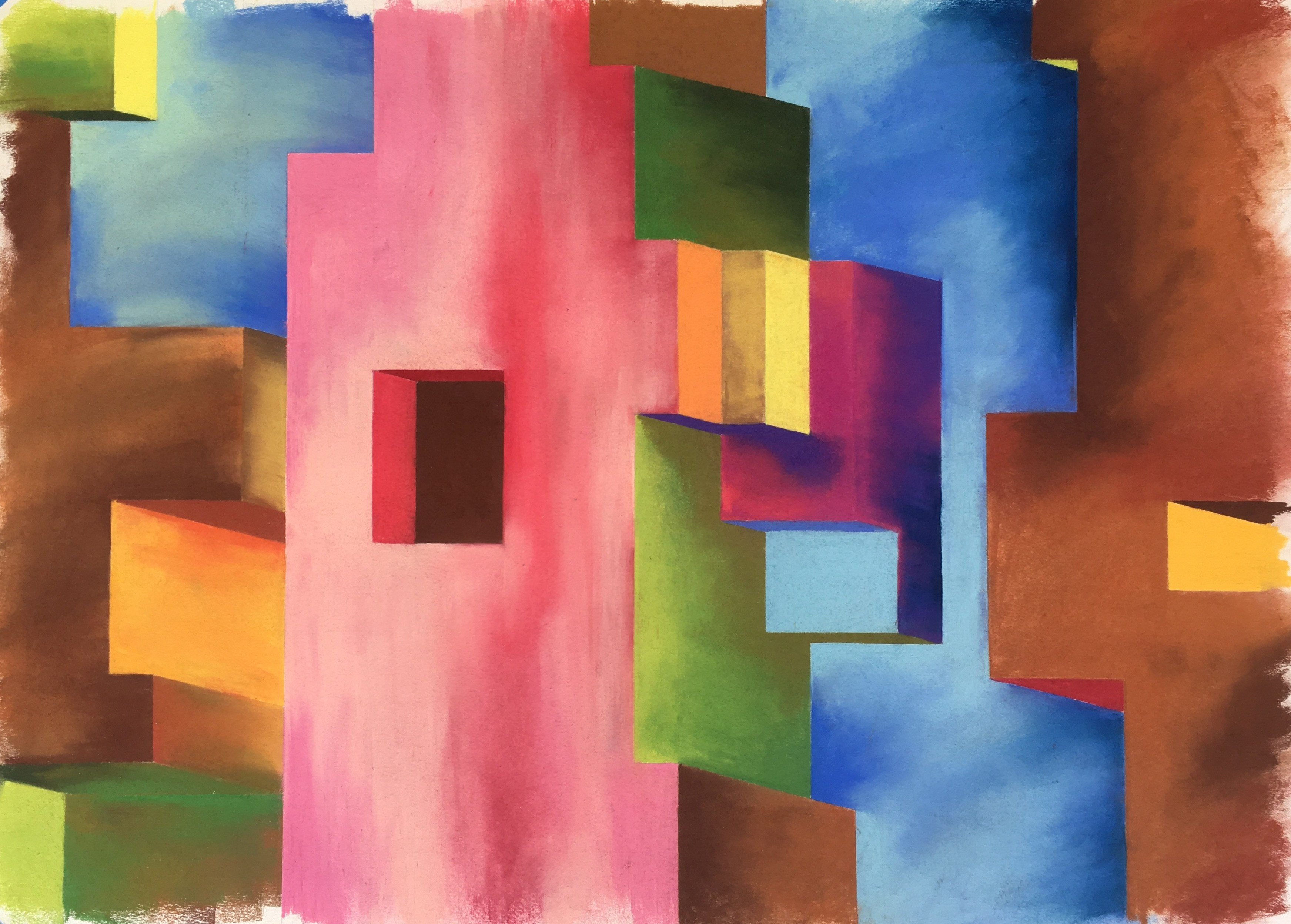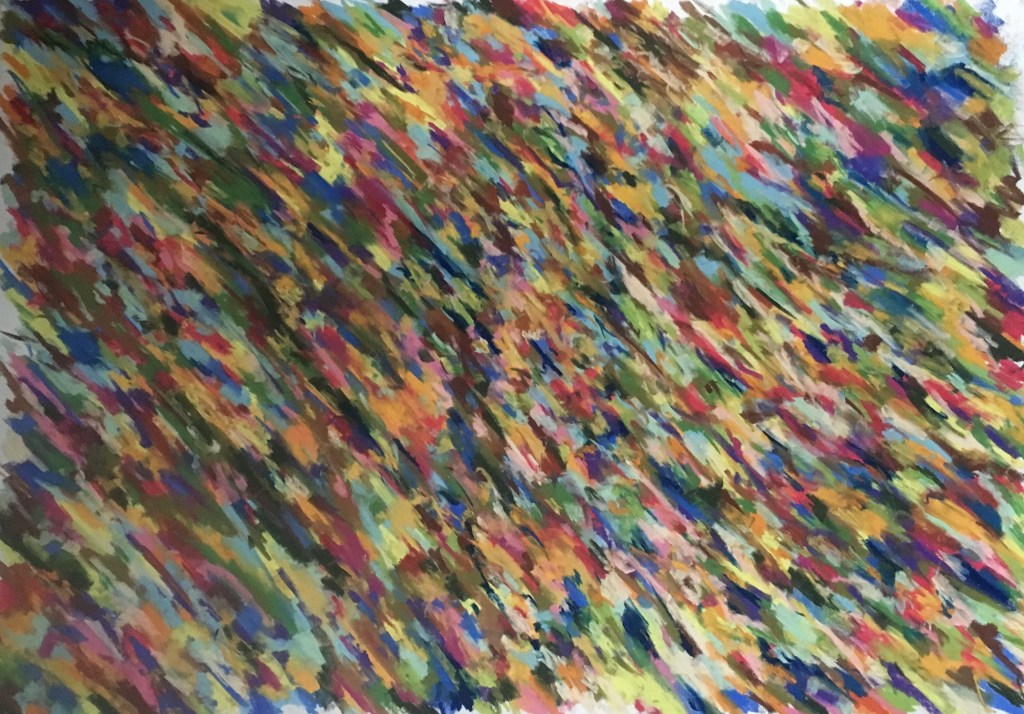 These “dreamy” takes on structure and randomness are fun, but (currently) a bit labor intensive. Incidentally, I call them “dreamy” only because a good friend once remarked on that character of these works. I have done 4-5 of this type. In some, a random “architectural” drawing with rectangular lines is sketched out, followed by occlusion of contained spaces (from right to left) with post-it notes or tape, and then I proceed in the opposite direction filling in shaded tones of random colors. In others, the dreaminess is more gestural. See other examples in the gallery below.