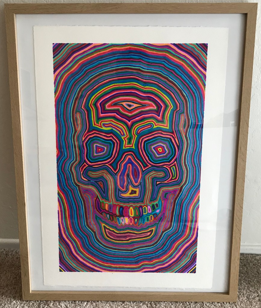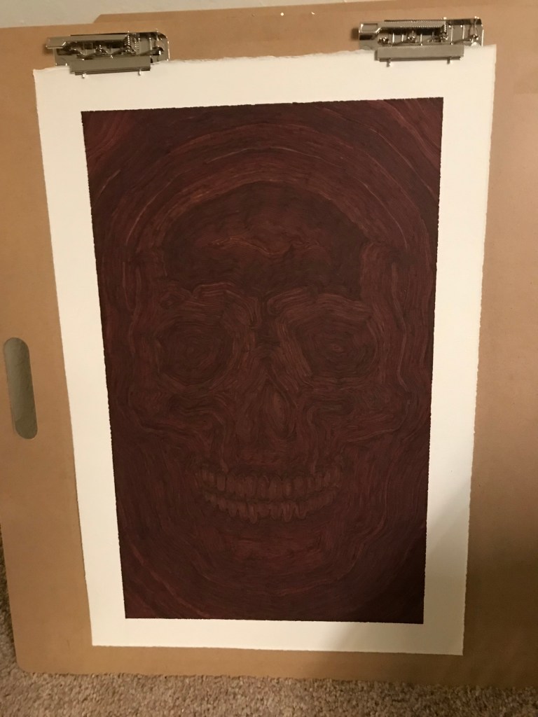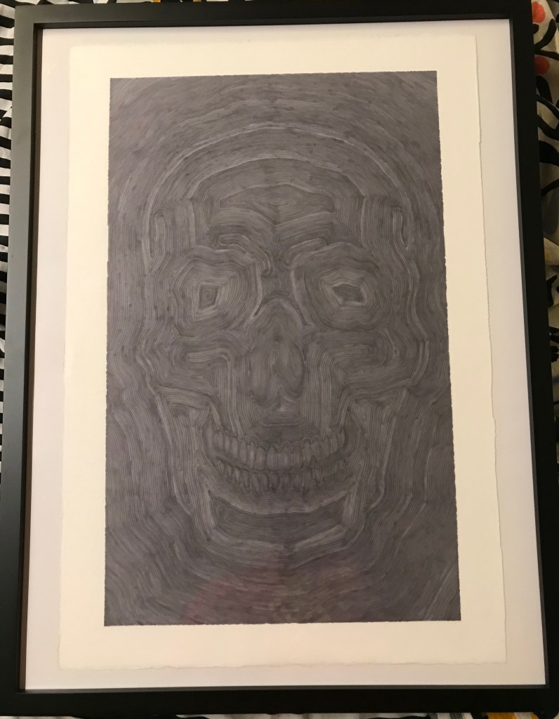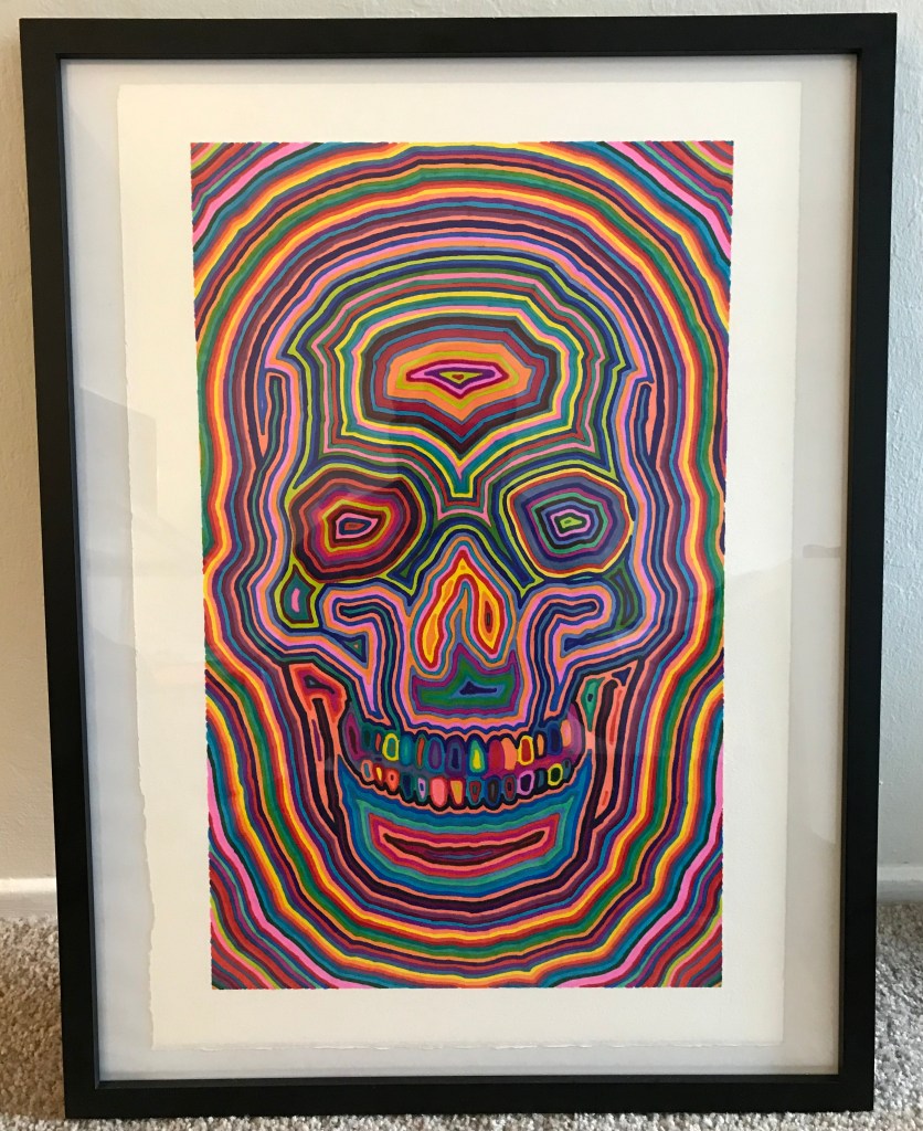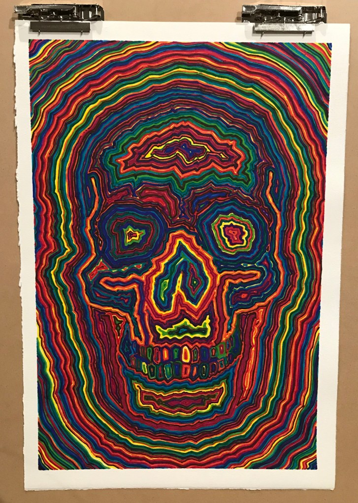 In anticipation of Dia de los Muertos in 2019, I started sketching calaveras of various types. One pattern I have settled into is drawing the rough outline of a calavera (from a single template, used repeatedly over different works) and then successively coloring in lines with randomly chosen sharpie markers. Sharpies have nice, “bright” tones, as well as generating interesting overlapping/blending effects on heavy Arches Rives BFK art paper. See other examples below.