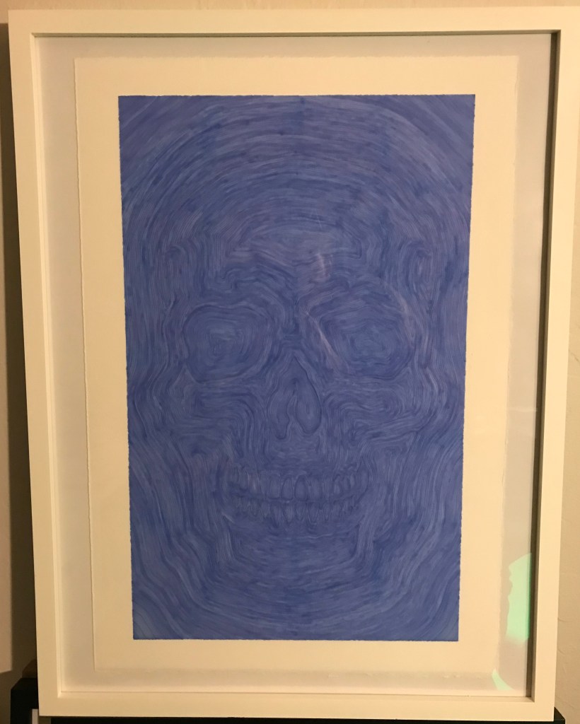 I’ve also done a few “monochromatic” calavera drawings with Sharpies. Here the overlapping effects of “bleeding” markers on the heavy paper are most pronounced and interesting. So far I’ve done these in grey (which works quite well), blue (at left), green, brown, black (which is also quite interesting), and orange. See other examples in the gallery below.